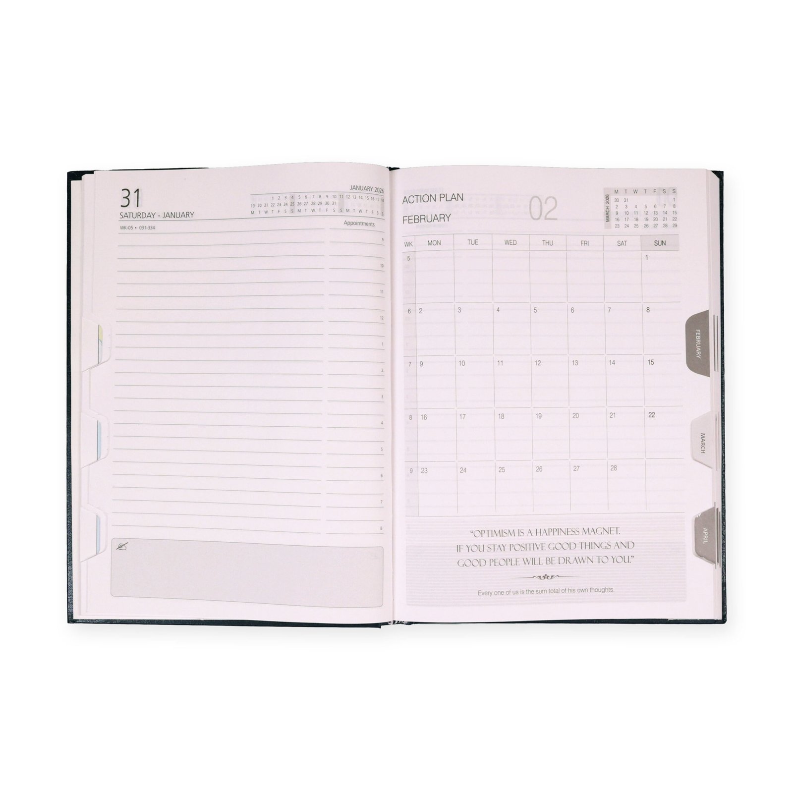 Stand out with this Prime premium B5 diary from Foru products featuring a unique color-changing imitation leatherette PU cover. Foam-padded on both sides with imitation stitching, it combines durability with modern flair. One color printed pages on natural shade paper with subtle graining offer a smooth writing experience. The diary includes one date per page, month tabbing, and is enhanced with two-color graphics, leaf foiling, and blind deboss effects. Available in 3 vibrant colors and packed individually, perfect for professionals who value style and organization.