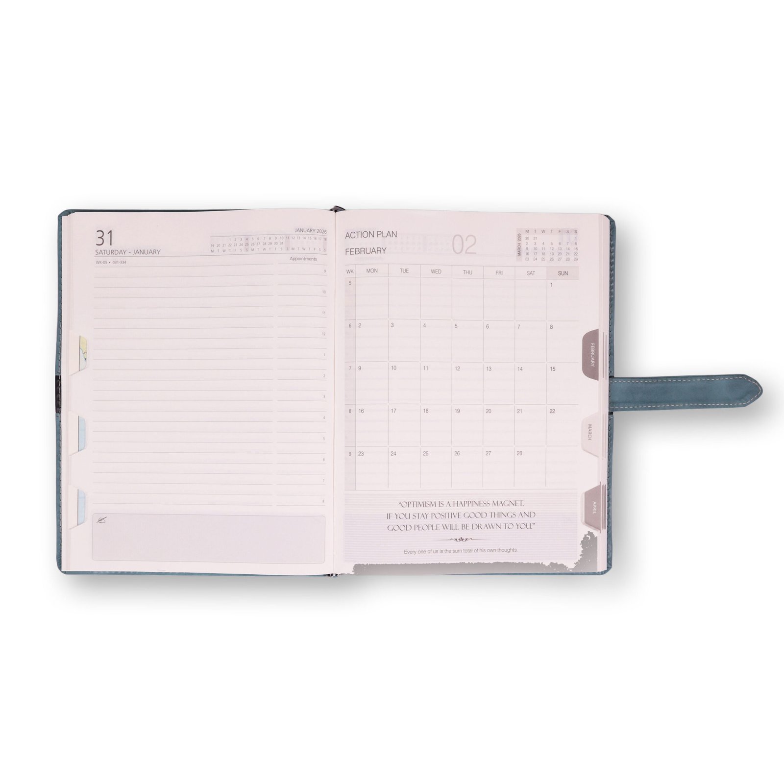 This GoalCraft B5 diary features one date a page with planner and month tabbing on smooth natural shade paper with subtle graining, ensuring a comfortable writing experience. The foam-padded PU cover with imitation stitching offers durability and a premium look. Enhanced with elegant leaf foiling of the year, it adds a refined touch. Perfect for busy professionals to keep daily tasks and meetings organized. Also makes a thoughtful corporate gift from managers to employees. Available in 3 classic colors.