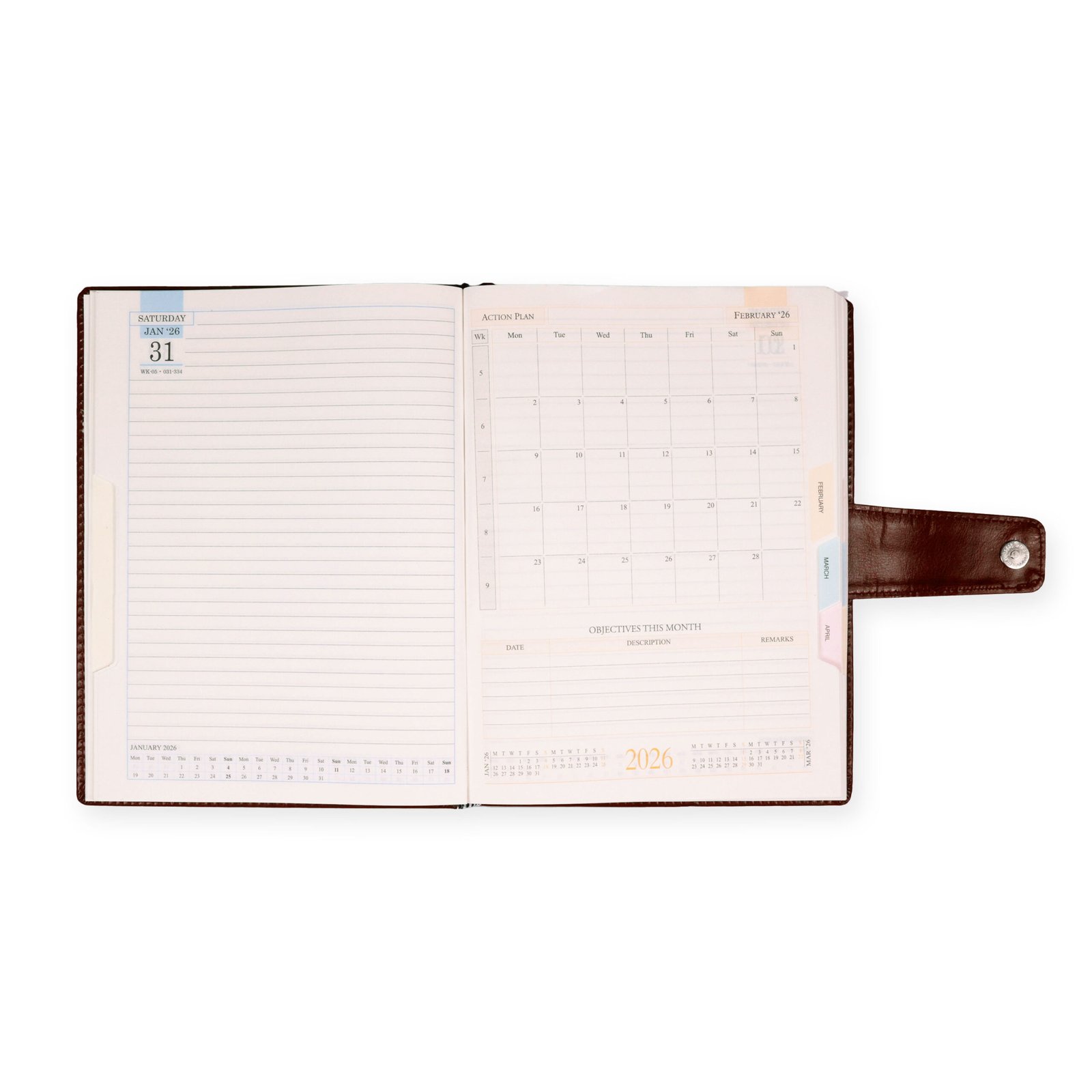 This Winner B5 diary features one date a page with planner and month tabbing, printed in vibrant multi-color on natural shade paper with a dedicated Sunday page for easy weekly planning. The elegant cover boasts a smooth finish, padded on both sides, and detailed with imitation stitching around the edges. Secured with a magnetic clasp, it offers both style and practicality. Enhanced with sophisticated leaf foiling of the year, this diary is available in 3 classic colors and packed individually. Perfect for professionals and a thoughtful corporate gift choice.